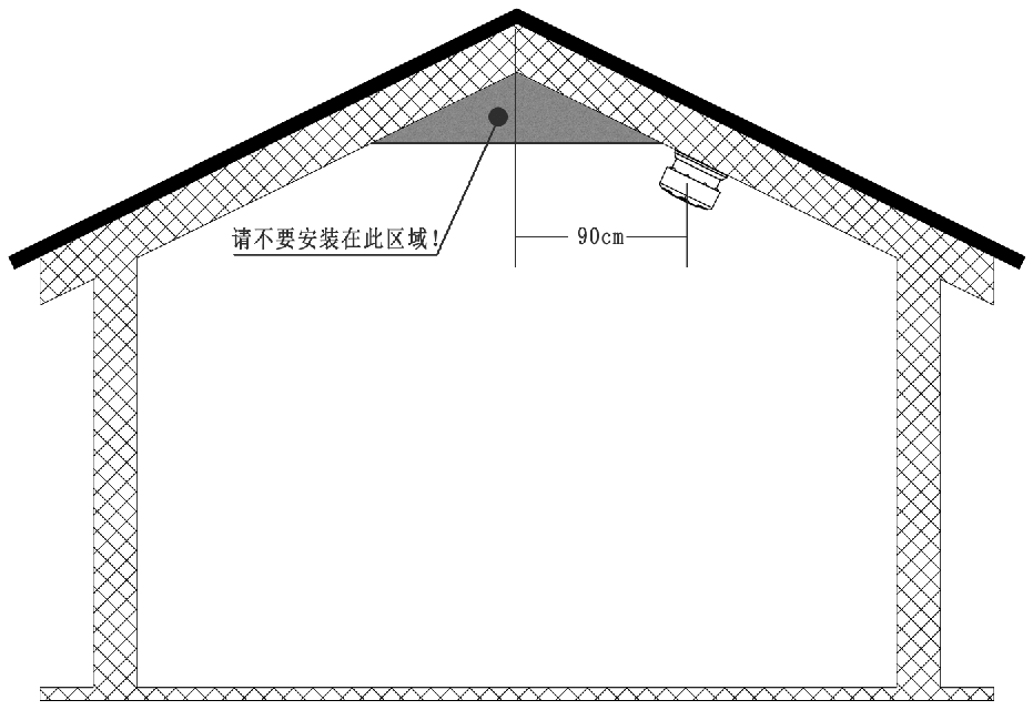 Jos asennat savuhälytyksen kaltevaan tai huippuneen kattoon, asennusasennon on oltava vähintään 90 cm korkeimmasta pisteestä.